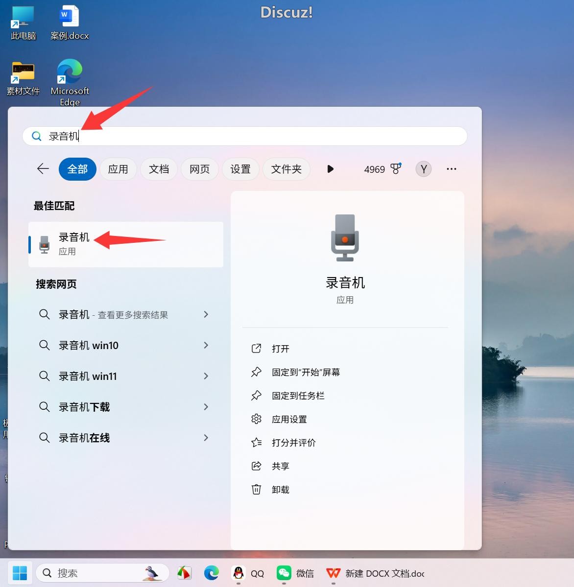 在搜索框中输入搜索关键词【录音机】,在【最佳匹配】下方点击匹配到的应用【录音机】。