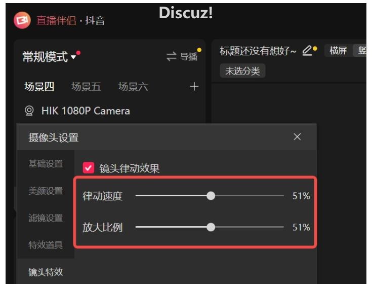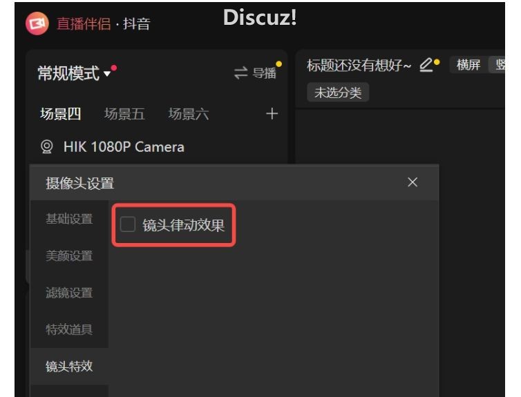 1、打开摄像头设置页面,在镜头特效栏中勾选“镜头律动效果”,即可生效