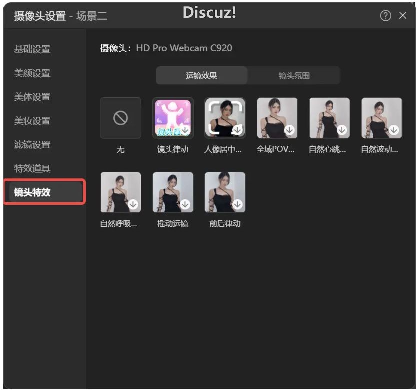 点击摄像头设置→镜头特效,这里可以根据您的需求选择运镜效果和镜头氛围。