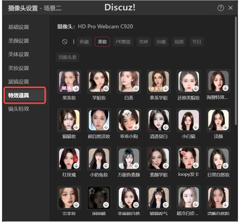 点击摄像头设置→特效道具,这里可以根据您的需求选择美妆特效、整蛊特效等特效道具。
