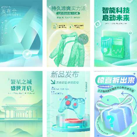 潮流配色薄荷漫波风格科技现代新品宣传海报PS模板设计素材29款