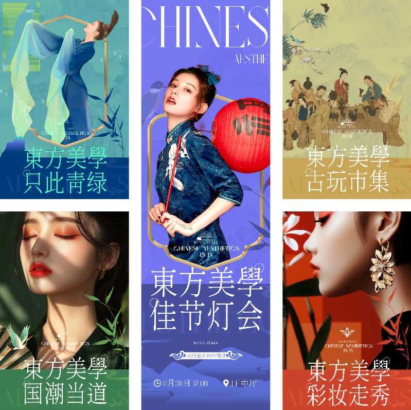 新中式东方美学国潮市集活动青绿古画宣传PS海报模板设计素材5款