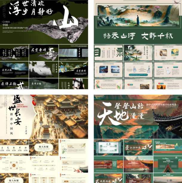 1GB精选国潮PPT合集,14套完整PPTX源文件,以江山卷轴+青山水墨+绿色国风为主视觉,融合新中式排版、古典纹样、青山远黛、留白意境,适配教学课件、文化汇报、品牌提案、公开课、文旅推介等场景,图文分层+一键换色+母版统一,新手也能10分钟完成高规格演示。