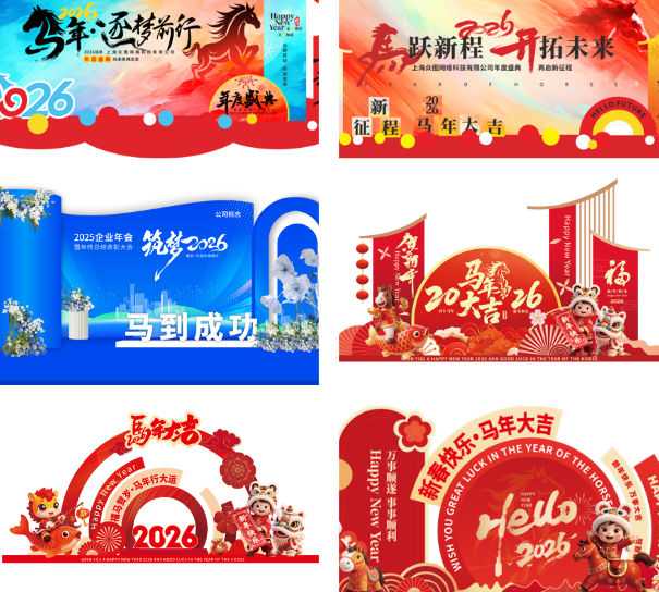 专为2026企业年会、年终晚会、马年新春活动打造的24套美陈源文件,1.28GB高码流,PSD+AI+CDR三格式。含马年IP、新春红灯笼、企业口号、打卡堆头、签名墙、LED背景等元素,矢量刀版+3mm出血+高清喷绘,3分钟替换企业Logo与主题语,即打即装,快速提升年会仪式感与品牌传播力。